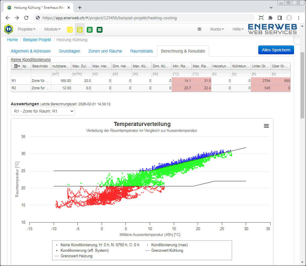 Das Modul "Heizung & Kühlung" ermöglicht die Bedarfsabklärung für Raumheizung und Raumkühlung nach SIA 380/2 durchzuführen. Der Leistungs- und Energiebedarf kann auf der Ebene Raum, Zone und Gebäude betrachtet werden.