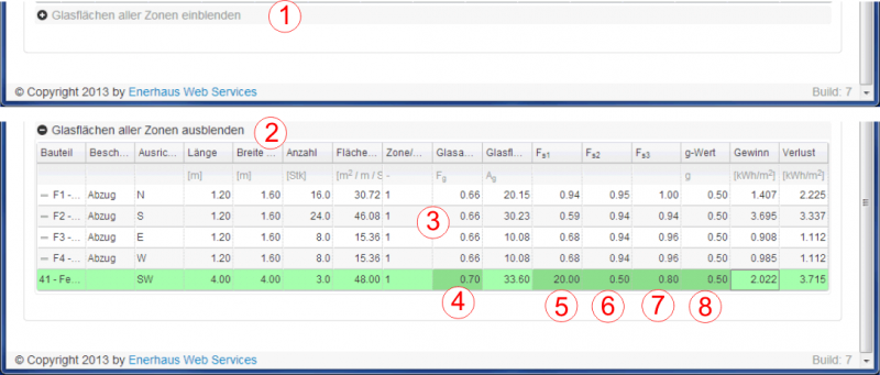 | 1 | Möglichkeit die Glas- und Verschattungseingaben einzublenden |